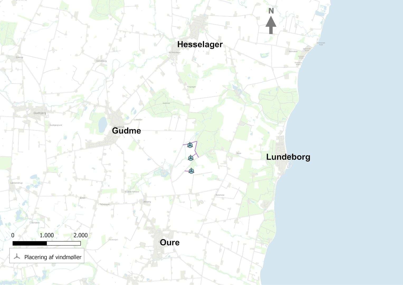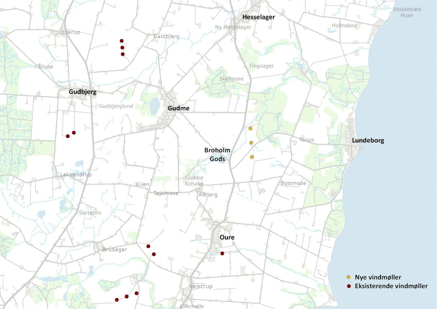 I området er der flere eksisterende vindmøller, se figur 6. Den nærmeste vindmølle står ved den sydlige del af Oure ca. 2,7 km fra de planlagte vindmøller. Vindmøllen har en totalhøjde på 42 meter og er opstillet i 1989. Vindmøllen må på denne baggrund formodes at være udtjent og forventes nedtaget inden for en kortere årrække. Vest for Oure står der to vindmøller med en totalhøjde på 75 meter i en afstand af ca. 3,7 km fra de planlagte vindmøller. Nordvest for lokalplanområdet i en afstand af ca. 4,0 km står der en række med tre vindmøller med en totalhøjde på 75 meter i landskabet nord for Gudme og Gudbjerg.