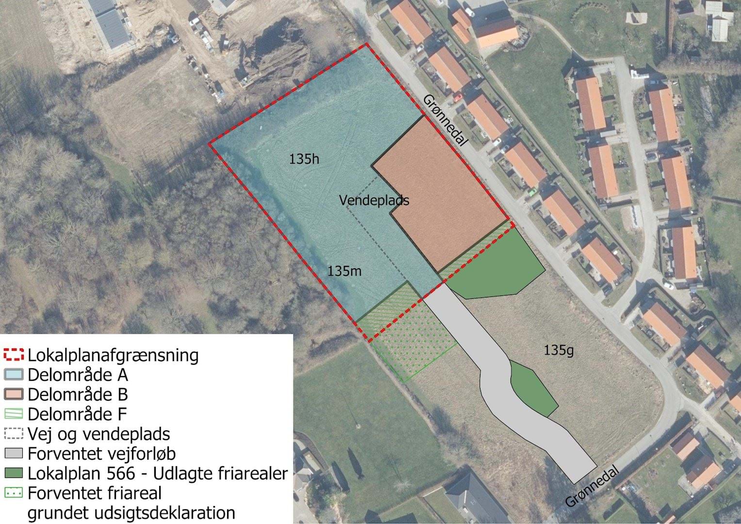 Afgrænsningen af delområderne er bestemt ud fra ønsket om at kunne opføre fritliggende enfamiliehuse i hele lokalplanområdet, men samtidig kunne placere dobbelthuse på en mindre del af området ned mod Grønnedal. Grunde til enfamiliehuse skal udstykkes på mellem 1.000 m2 og 1.999 m2, mens dobbelthuse skal udstykkes med en samlet grundstørrelse på mindst 1.500 m2 og som skal kunne udstykkes med mindst 750 m2 pr. bolig. Omfanget af fælles friarealerne er tilpasset forventet antal boliggrunde, hvorfor det ikke vil være muligt at udstykke mindre grund end lokalplanen giver mulighed for.