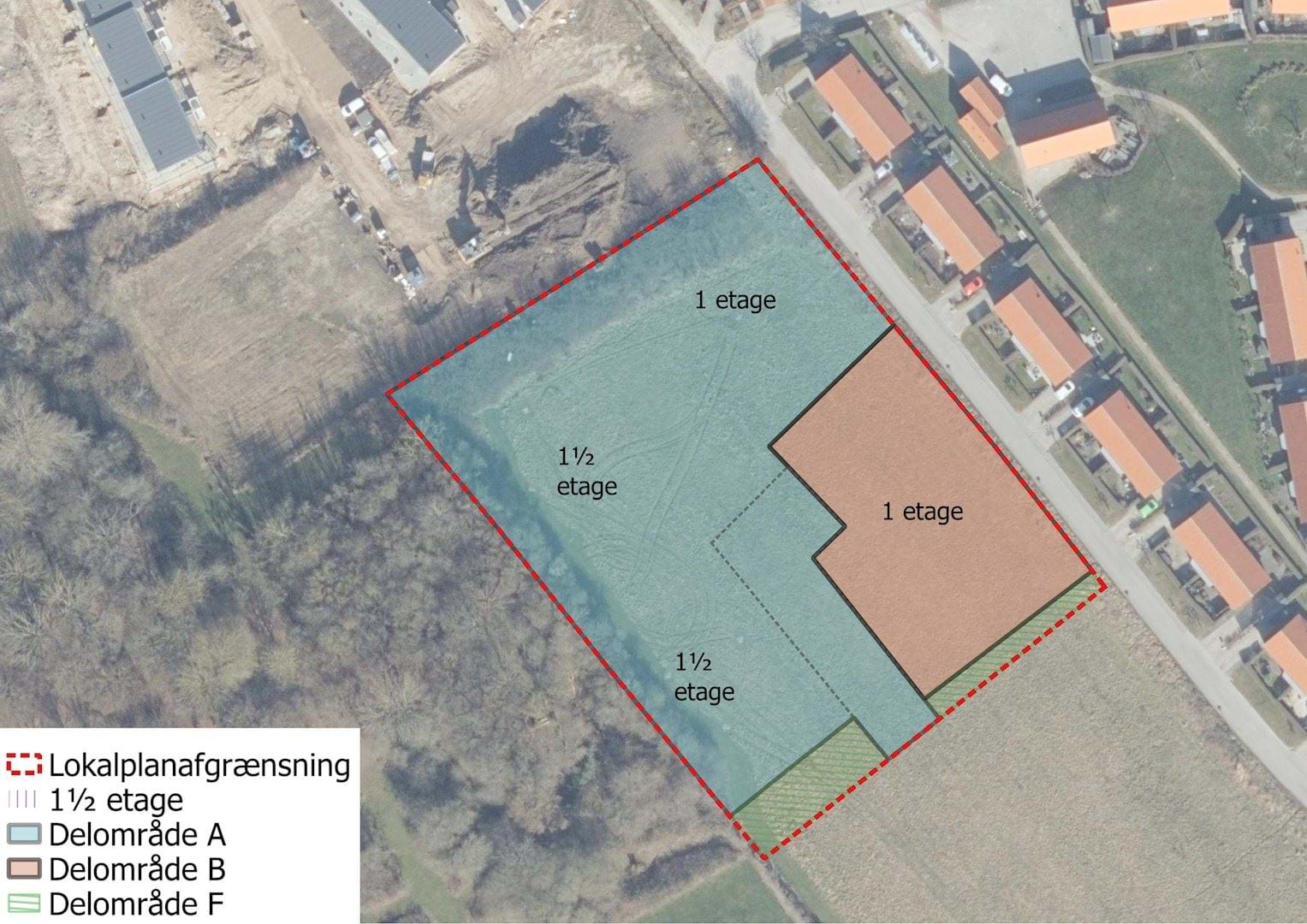 - Delområde B som udlægges til både åben-lav og tæt-lav boligbebyggelse i form af hhv. fritliggende enfamiliehuse og dobbelthuse.