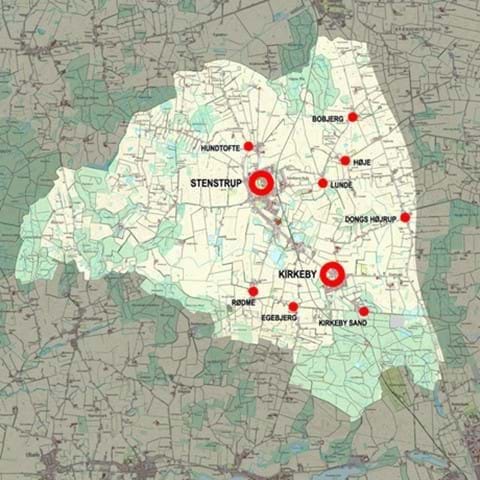 Lokalområdet Stenstrup-Kirkeby har tidligere fungeret som Fyns vigtigste centrum for teglværksindustrien, og byvæksten er i høj grad sket omkring de to stationsbyer på Odense-Svendborg-banen. Vejforløbet ved Kirkeby Kirke har været et knudepunkt langt tilbage i tiden, men indtil 1800-tallet lå de fleste boliger som spredte gårde i landskabet. I slutningen af 1800-tallet og omkring 1900 blev der bygget villaer langs landevejen, og Kirkeby udviklede sig til en landsby med forsamlingshus og smedje mv.