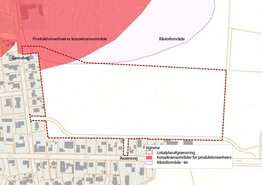 Et mindre areal indenfor lokalplanområdet er udpeget råstofgraveområde. Da overlappet mellem lokalplanen og det udpegede graveområde, for rødbrændende ler på matrikel 12a, er placeret i udkanten af graveområdet og kun udgør et begrænset areal på omkring 2000 m2, er det Region Syddanmarks vurdering at lokalplanen ikke er i strid med råstofplanen.
