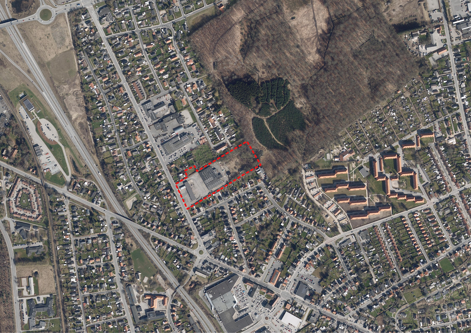 Kortet viser lokalplanområdet. Lokalplanens afgræsning er vist med en rød stiplet linje.