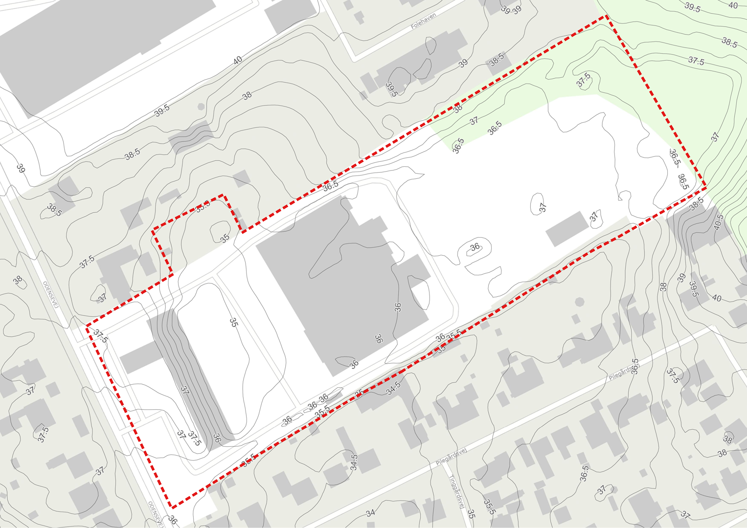 Kortet viser lokalplanområdet og højdekurver i området. Højdekurverne er vist med 0,5 meter.