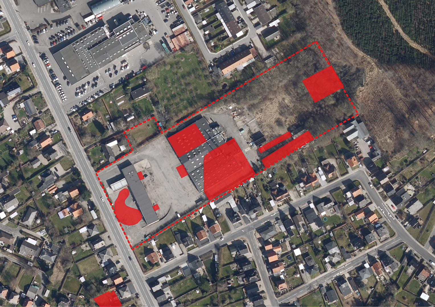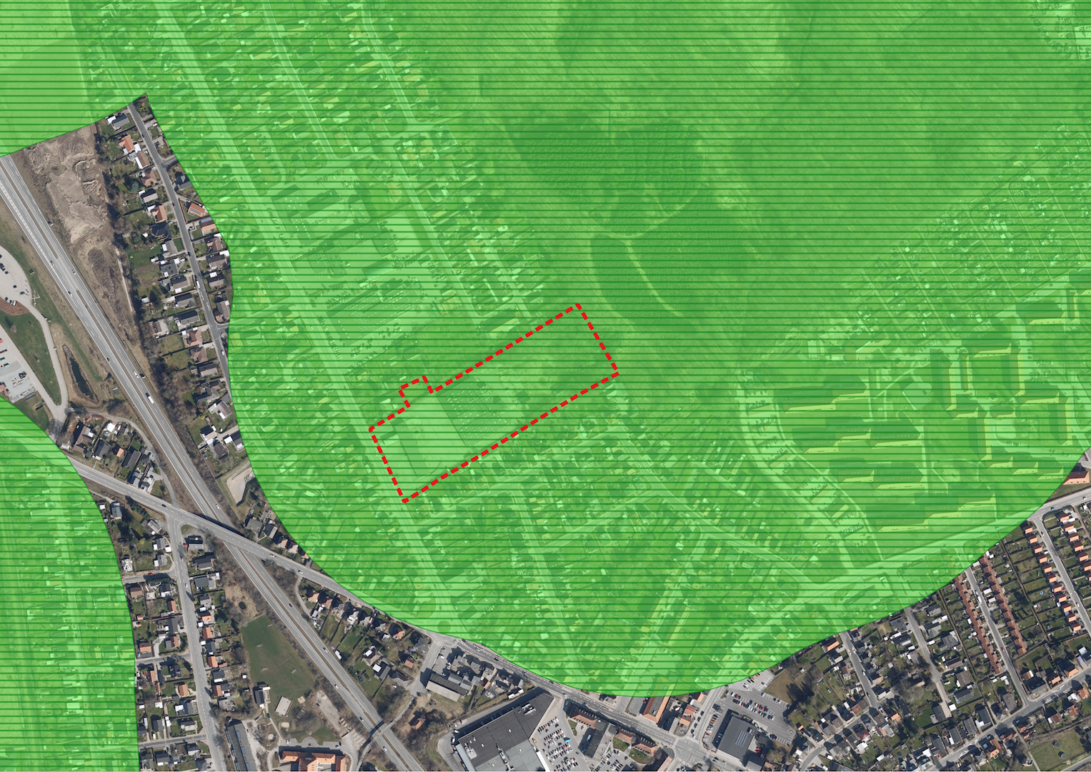Kortet viser lokalplanområdet og arealer, hvor der er kortlagt jordforurening på vidensniveau 2. Området, hvor der er jordforurening på vidensniveau 2, er skraveret med rød.