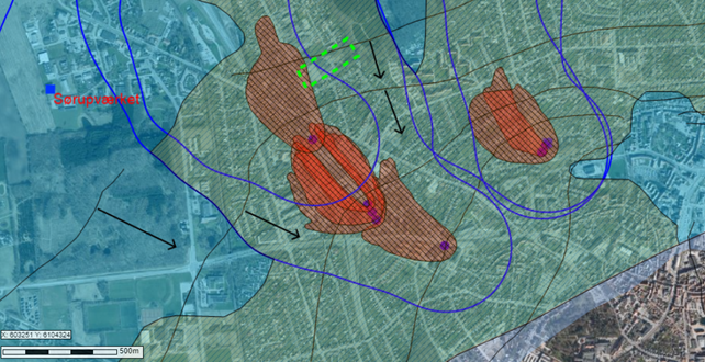 Indvindingsoplandet viser det område, hvor vandet vurderes at kunne strømme frem til boringerne inden for 200 år og BNBO’erne viser det område hvor vand vurderes at kunne strømme frem til boringen indenfor 1 år. En del af lokalplanområdet ligger indenfor BNBO’et og indvindingsoplandet til en af boringerne tilknyttet Sørupværket. Lokalplanområdet ligger således i et område, hvor grundvandsdannelsen vurderes at kunne bidrage med vand til Sørupværkets boring. Grundvandspotentialerne (grundvandsspejlet) er vist med sorte linjer og grundvandets strømningsretning er vist med sorte pile. Ifølge grundvandspotentialerne i det dybereliggende grundvand, som Sørupværket indvinder fra, løber grundvandstrømmen fra nordvest mod sydøst. Flere af Sørupværkets boringer samt boringerne tilknyttet Grubbemølleværket ligger nedstrøms lokalplanområdet mod Svendborg Sund. Disse boringer kan dermed blive påvirket hvis der opstår en forurening af grundvandet i forbindelse med lokalplanområdet.