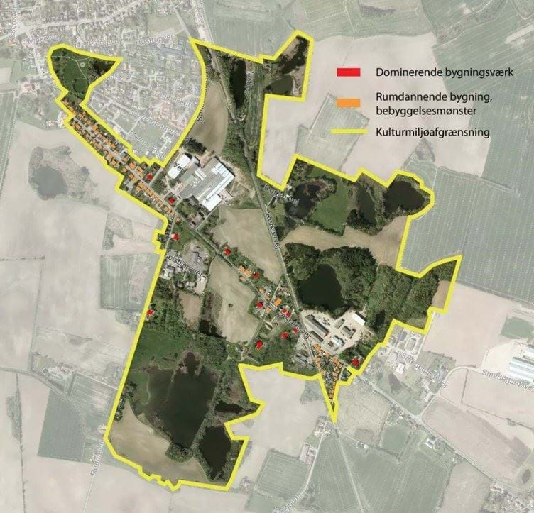 Kortet viser afgrænsningen af kulturmiljøet ”Stenstrup teglværkerne”. Dominerende bygningsværk inden for lokalplanens område er nedrevet.