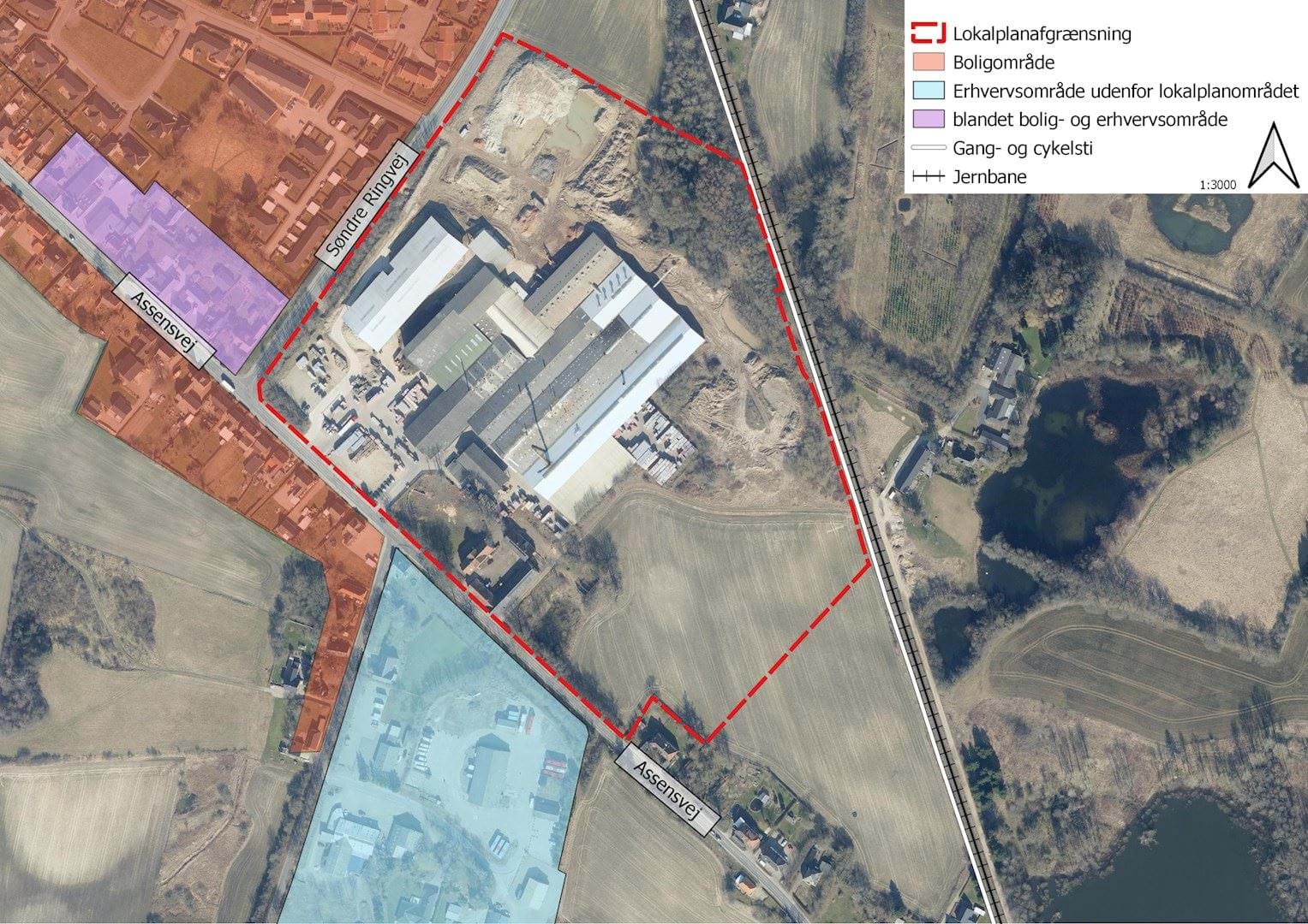 Lokalplanområdet ligger i den sydøstlige ende af Stenstrup by og omfatter det eksisterende teglværk og tilstødende arealer. Mod nordvest og vest afgrænses området af Søndre Ringvej og et større boligområde med parcelhuse og rækkehuse. Jernbanen og det åbne land med dyrkede marker afgrænser området mod øst og området afgrænses mod syd af Assensvej, som er hovedvejen gennem Stenstrup. Syd for Assensvej ligger både boliger og et større erhvervsområde. Ud mod Assensvej, langs vejens nordlige side, ligger ligeledes boliger.