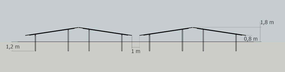 I Fixed-tilt E/W varianten, opstilles solpanelerne i nord/syd orienterede rækker med øst og vest vendte solcellepaneler, og monteres på stålstativ i en fast hældning på omkring 20 grader. Der opstilles parallelle rækker med 0,6-3 meters mellemrum. I denne opstilling ønskes opsamling af energi særligt tidligt og sent på dagen. Fra den laveste kant af solplanener er afstanden over jorden 80 cm. Installationen er maksimalt 1,7 meter over terræn, I de følgende figurer er vist en byggehøjde på 1,8 meter, svarende til den teknologi, der anvendes i dag. Dette er den forventede højde på et fuldstændigt plant terræn. De følgende 2 figurer viser en Fixed-tilt E/W opstilling fra forskellige vinkler, og illustrerer højde og afstandsmål.