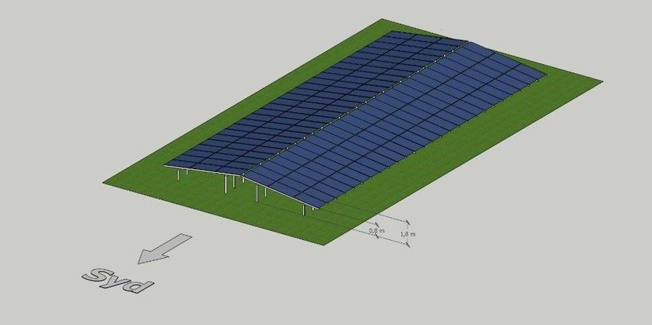I den følgende figur 4 er der vist en byggehøjde på 2,7 meter, svarende til den teknologi, der anvendes i dag. Dette er den forventede højde på et fuldstændigt plant terræn. For at kunne justere for ujævnheder, samt for at tage forbehold for udvikling i panelernes teknologi og dermed fastsættes den maximale højde til 3,5 meter over naturligt terræn.