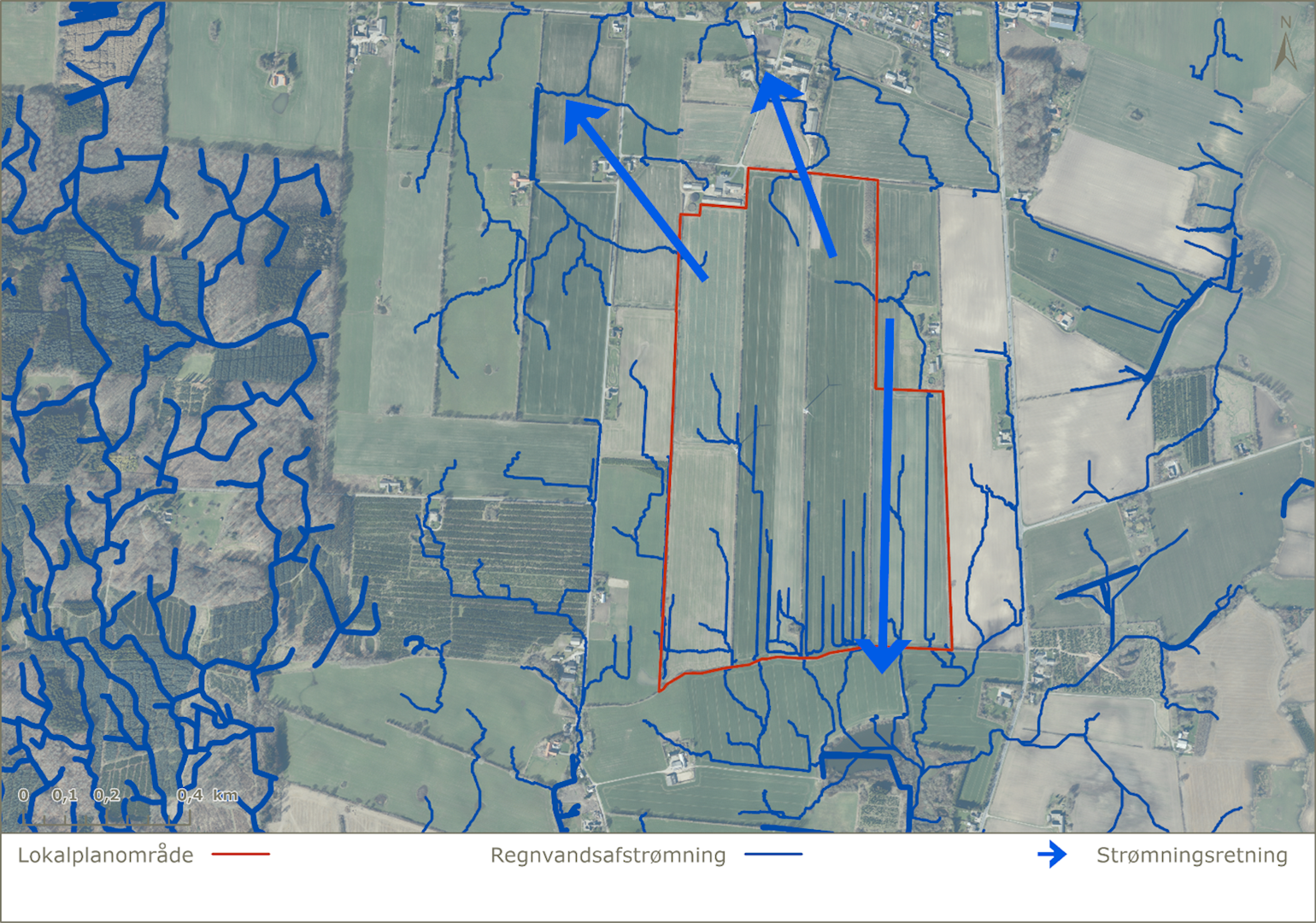I dag består lokalplanområdet af dyrkede landbrugsarealer. Regnvandet bevæger sig hovedsageligt fra nord mod syd og en mindre del af regnvandet strømmer mod nord og vest. Ved almindelige nedbørsmængder vil regnvandet sive ned i jorden, men ved kraftigere nedbørsmængder kan afstrømningen øges mod syd. Overfladevandet fra den nordlige del vil strømme over Højlundsvej mod vandløbet Stokkebæk. I den resterende del af området vil regnvandet blive ledt mod syd mod vådområdet Sortemosen og videre til Vejstrup Å.