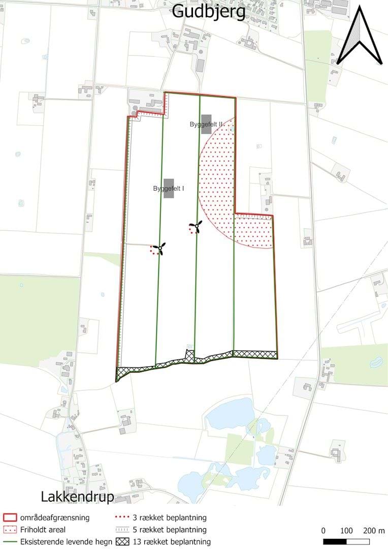 Der etableres et tre-rækket beplantningsbælte syd og vest for eksisterende vindmøller. Beplantningsbæltet etableres i nærhed til servicearealets afgræsning.