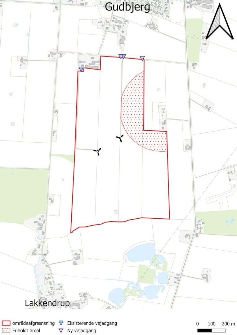 Det friholdte areal udlægges i lokalplanen som følge af solcellebekendtgørelsens §3 stk. 4.2, hvor det foreskrives at der bør afholdes en minimumsafstand på 300 meter målt fra bygninger, hvis der planlægges for solceller på to sider af beboelsen.