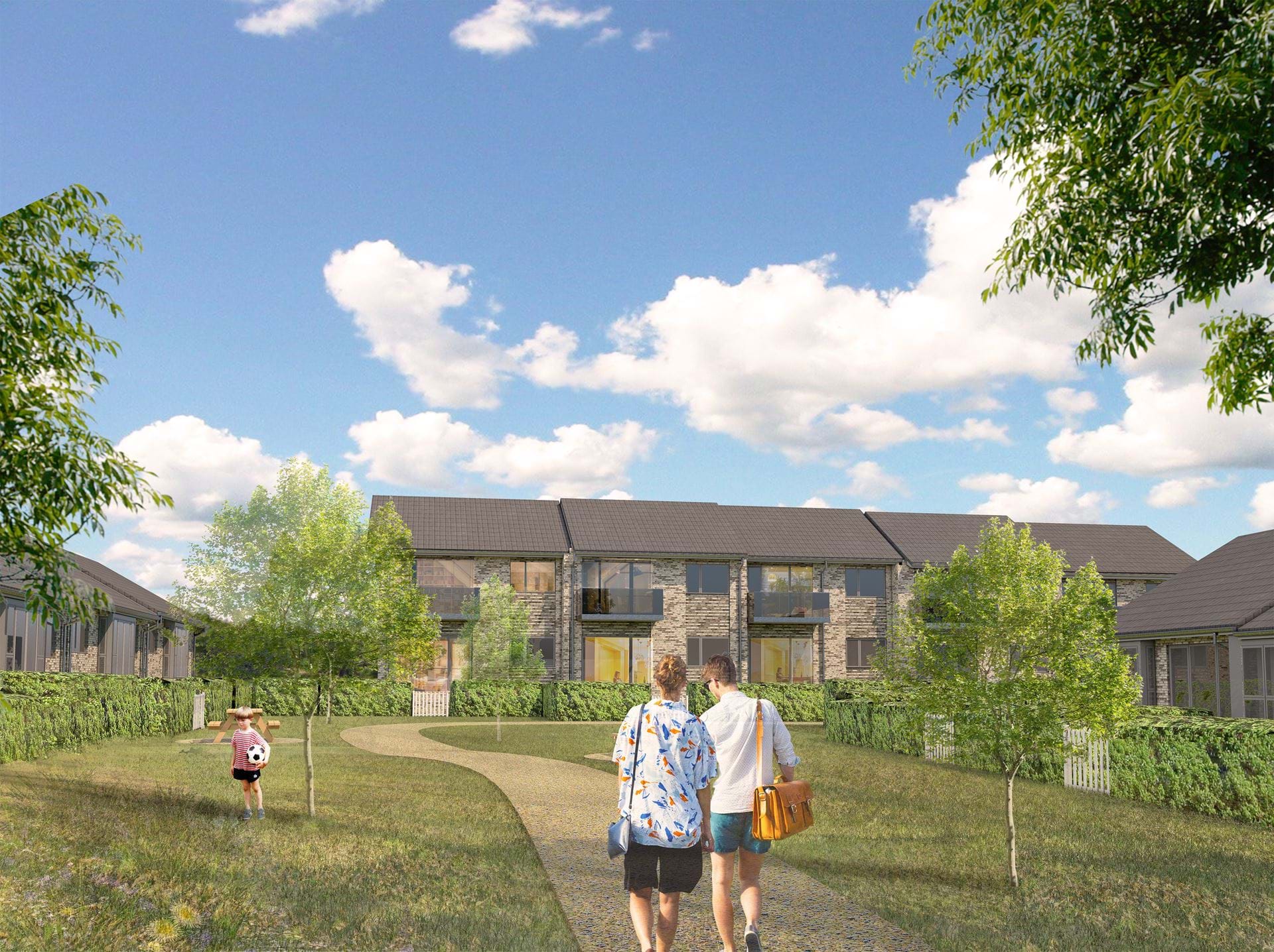Visualisering af fælles opholdsarealet i midten af delområde B og boliger (udarbejdet af C&W Arkitekter).
