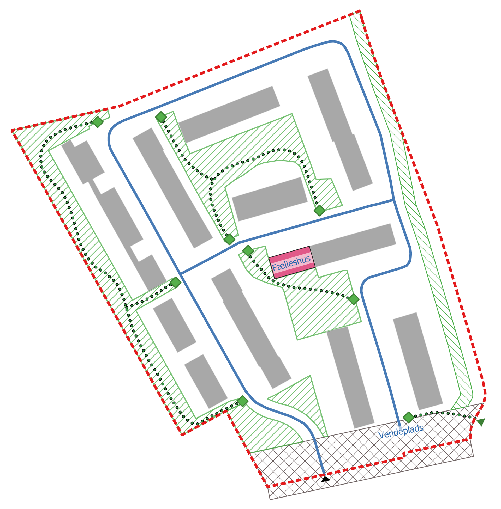 Det er hensigten, at skabe et tæt boligområde, men som inspirerer til et fællesskab mellem områdets beboere. Derfor vil lokalplanen søge at skabe en naturlig overgang fra de små private haver til fælles opholdsarealerne i form af lave hække eller brede åbninger i hækken mod fællesarealerne.