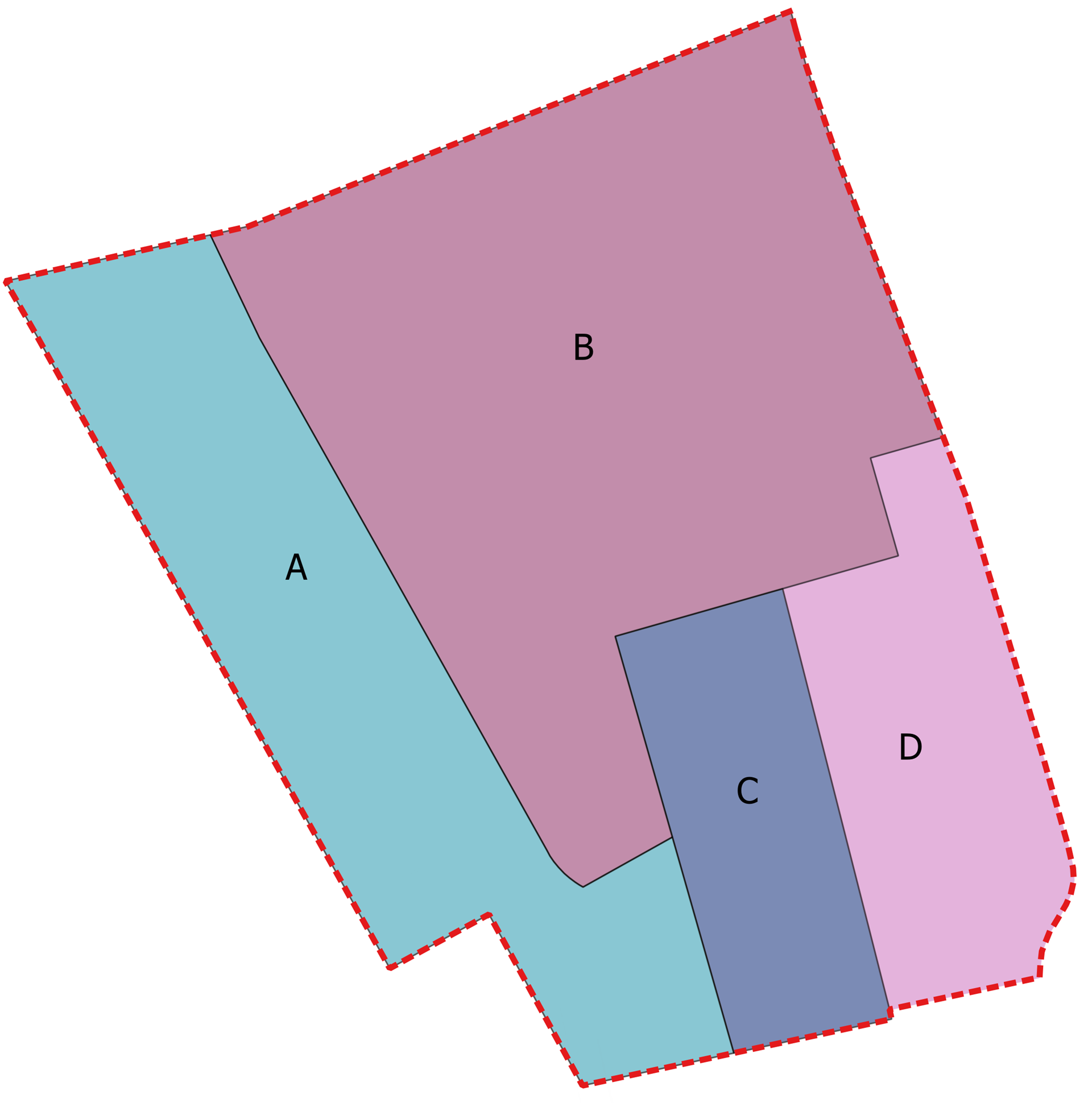 Dispositionsplan som viser de fire delområder.