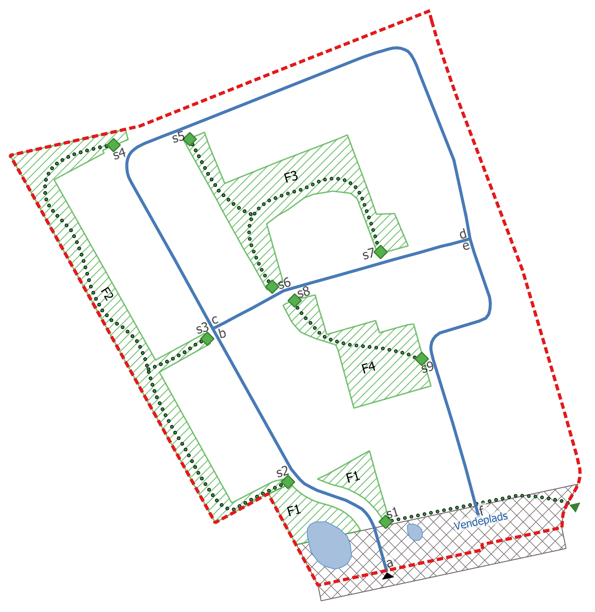 Der skal som minimum etableres opholdsarealerne F1-F4 efter de principper som er beskrevet herunder. Opholdsarealerne F1-F4 dækker størstedelen af lokalplanområdets arealkrav, men der vil være behov for at placere supplerende opholdsarealer i forbindelse med endelig realisering af boligområdet.